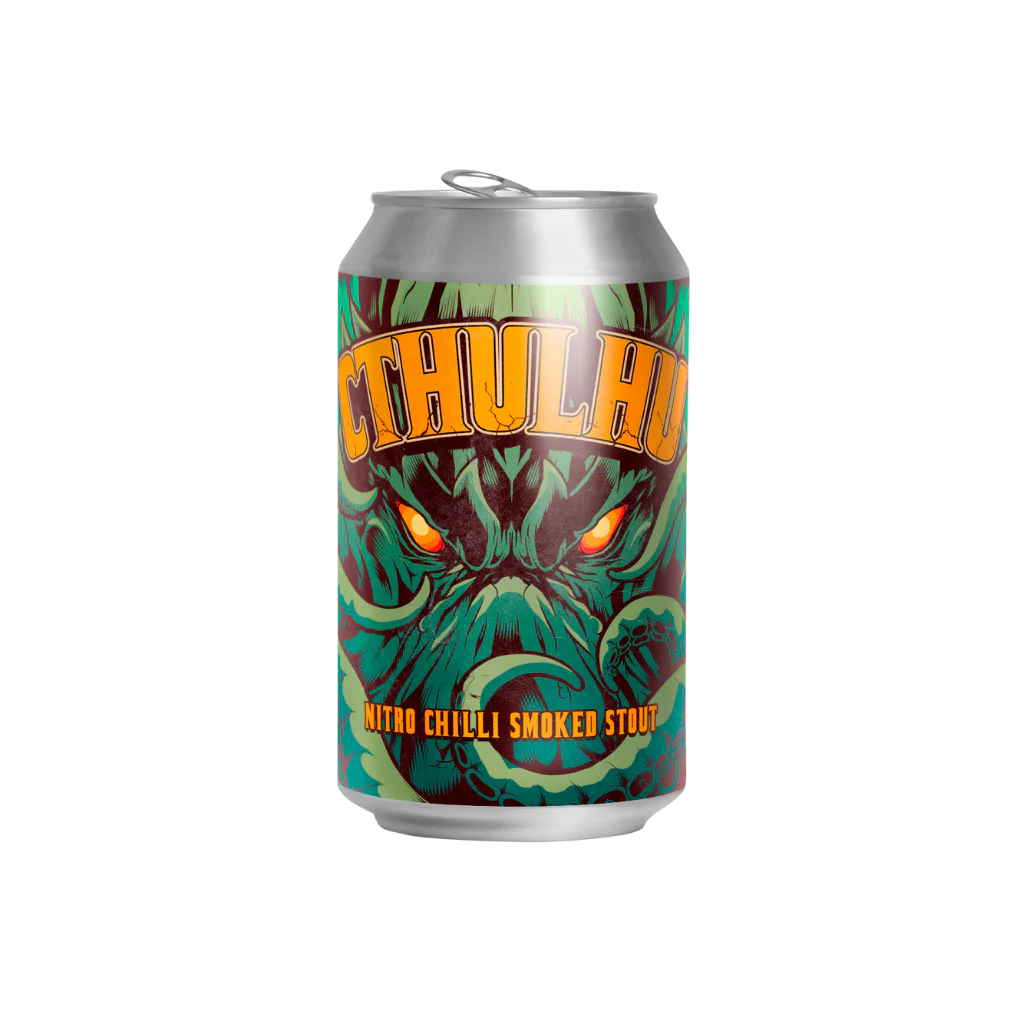 Cthulhu es una cerveza estilo Nitro Chilli Smoked Stout, una combinación armoniosa entre los torrefactos de las maltas oscuras, notas ahumadas y el picante del chilli. De color marron oscuro, con una espuma de color canela, densa y persistente gracias a la inyección de nitrógeno.