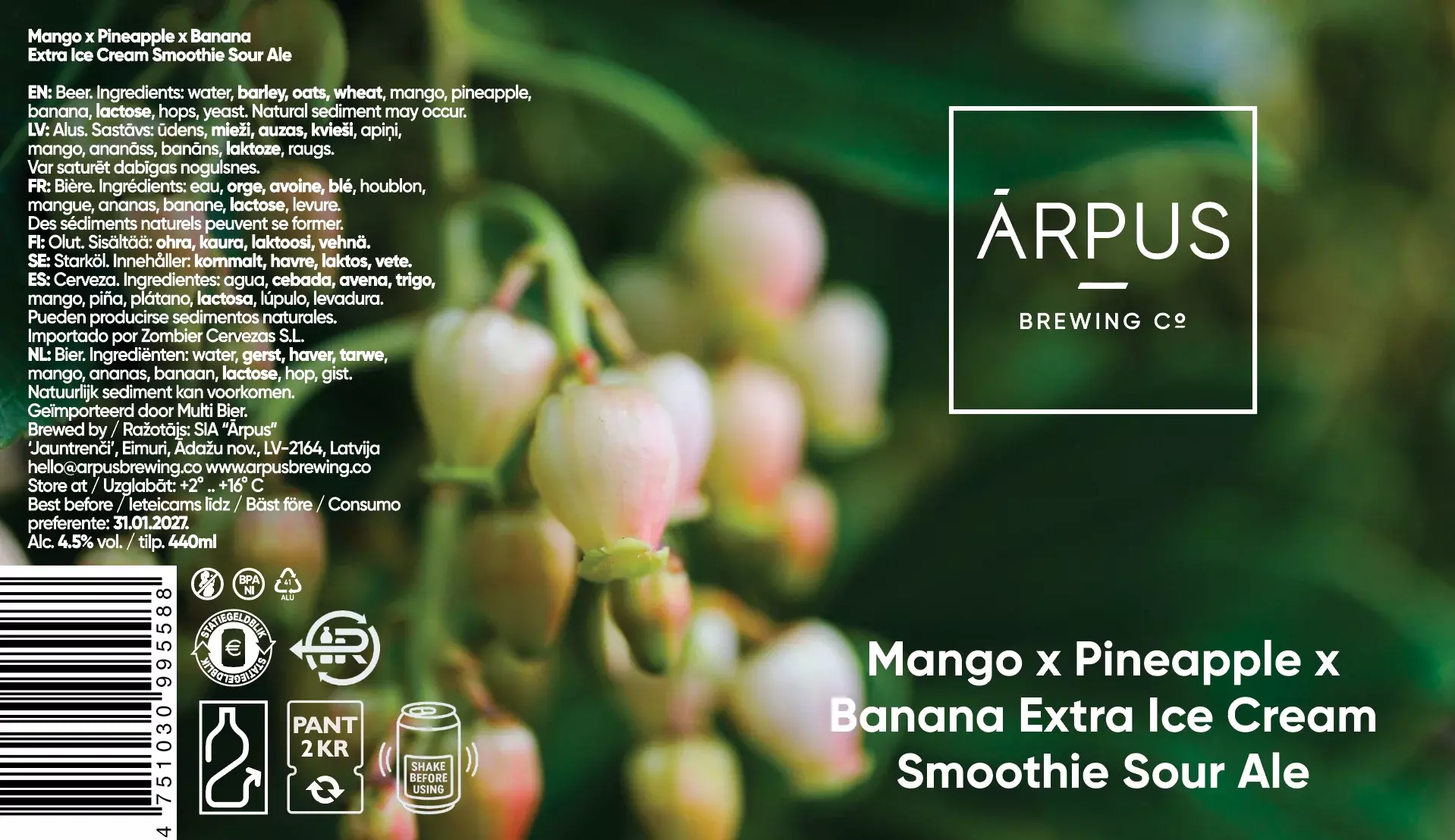 Arpus Mango x Pineapple x Banana Extra Ice Cream es una Smoothie Sour con mango, piña, plátano y lactosa.