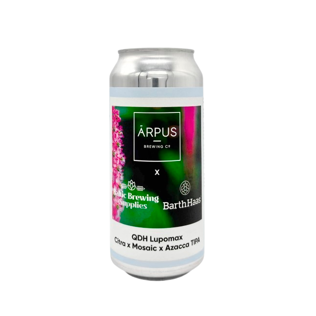 Arpus QDH Lupomax Citra X Mosaic X Azacca es una Triple IPA con cuádruple dry hop, colaboración con Baltic Brewing Supplies y BarthHaas.