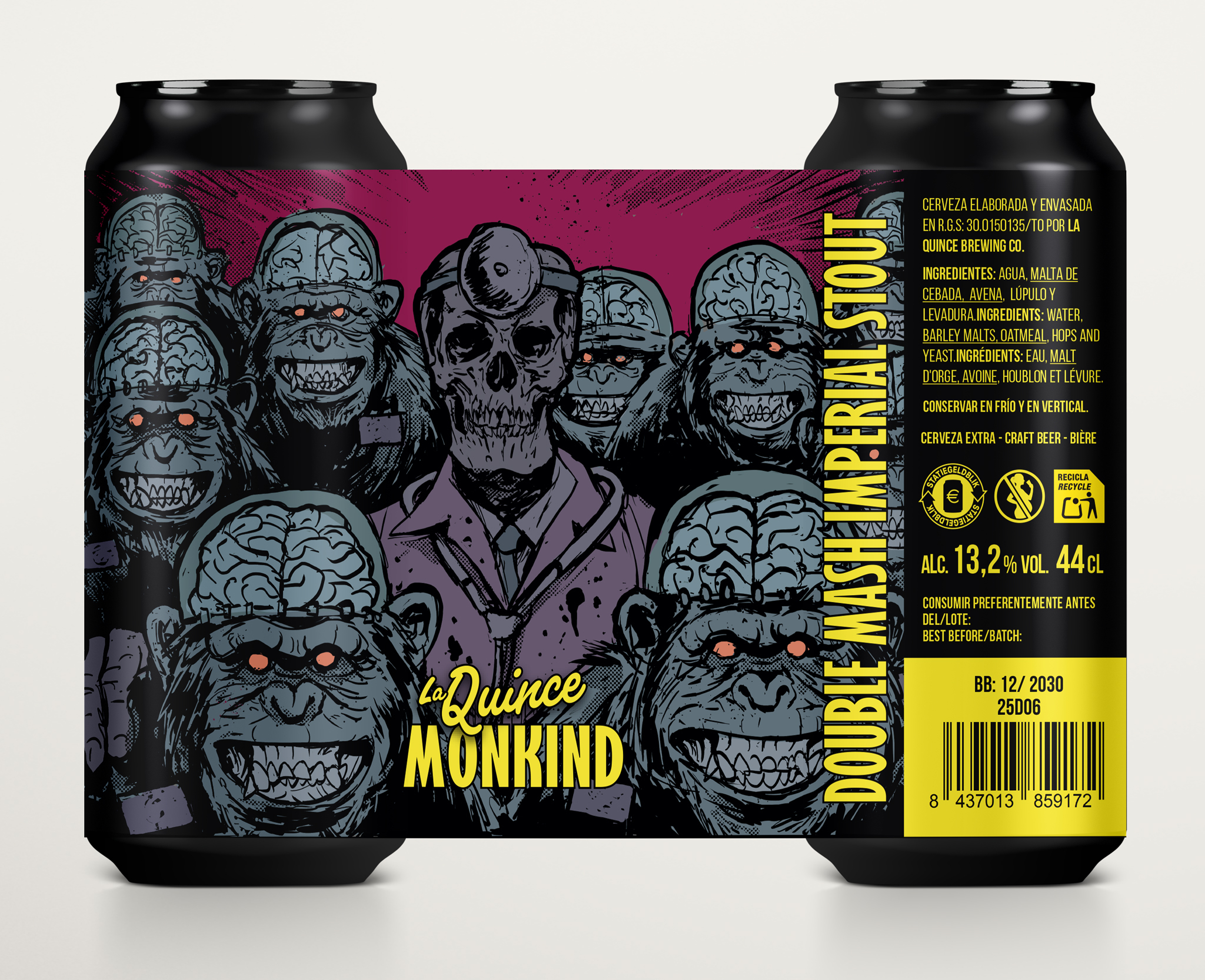 7,65 € IVA incl.La Quince Monkid es una Double Mash Imperial Stout nano batch. MUY LIMITADA (solo 500 latas) dada la tremenda merma que provoca hacer un doble más con un claro objetivo de romper la barrera de densidad con grado plato 29 aka 13,2% abv. ideal para entrar en calor.