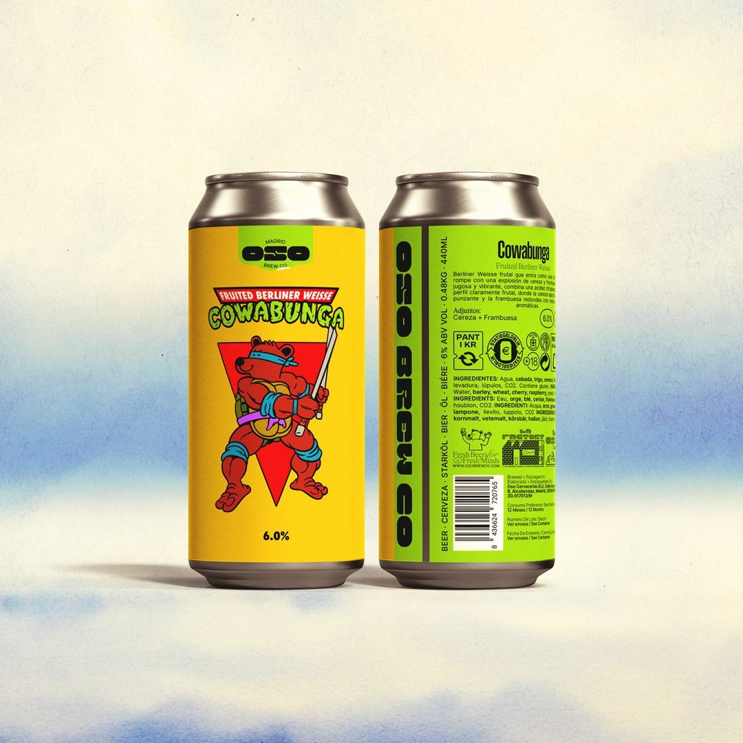 Oso Brew Cowabunga es una Berliner Weisse frutal que entra como una ola fresca y rompe con una explosión de cereza y frambuesa. Ácida, jugosa y vibrante, combina una acidez chispeante con un perfil claramente frutal, donde la cereza aporta un punto punzante y la frambuesa redondea con notas suaves y aromáticas