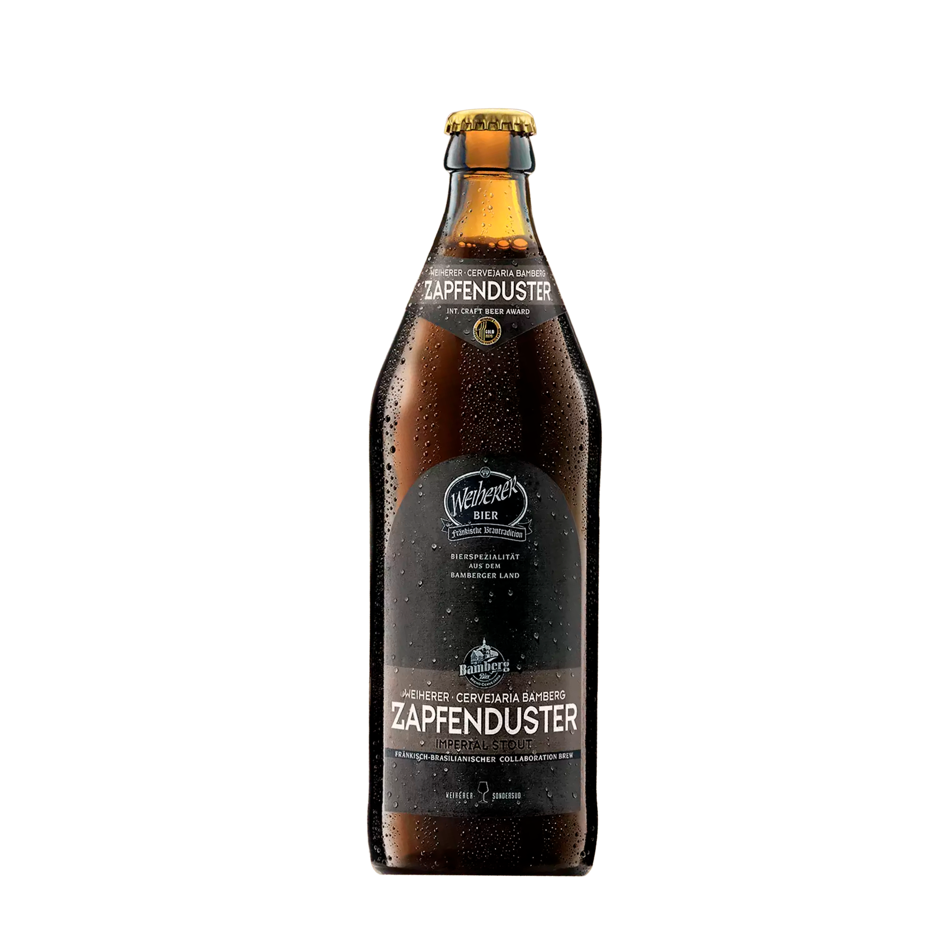4,99 € IVA incl.Weiherer Zapfenduster es una Imperial Stout de color negro profundo (en dialecto, zapfenduster), con una especial nota de malta ahumada. Elaborada con motivo de la Semana Internacional del distrito de Bamberg, reúne todo lo que caracteriza a este estilo de cerveza fuerte y de fermentación alta: plenitud en boca, notas de chocolate y café, y un efecto cálido que perdura largo tiempo. Nuestra nueva cerveza de la amistad.